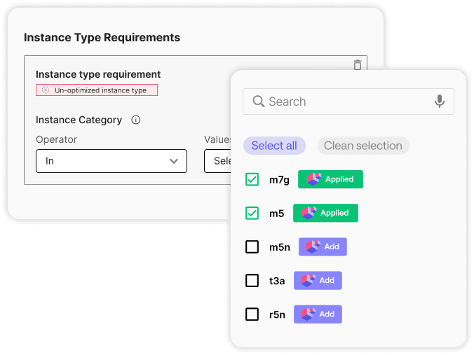 ScaleOps automatically selects the best families, generations, and sizes based on the pods running in your cluster. One click can replace inefficient nodes, and ScaleOps continuously keeps you on the most cost-efficient mix. It uses the AWS EC2 Fleet API to launch an optimized blend across availability zones and instance types. All configuration stays in your cluster, with no extra cloud permissions required.