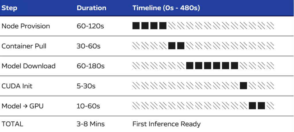 Three to eight minutes might seem tolerable for a batch job. For inference, it’s catastrophic. Users expecting sub-second responses have long abandoned the request. The GPU ran for several minutes processing zero inferences — you paid for compute that served no one.