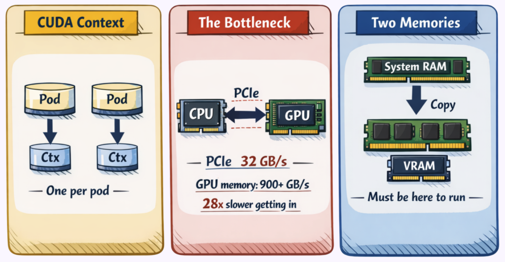 Contexts are not shared between processes. A node with a warm GPU and idle VRAM still requires full context initialization for every new pod. The GPU driver doesn’t know or care that another container already went through this process.