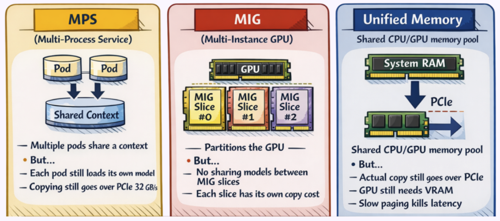 MPS improves utilization, but with constraints. All processes must coordinate within a single CUDA context on the same container—it’s not a Kubernetes-native mechanism. And each process still loads its own model weights into VRAM; the shared context reduces some per-process overhead, but model loading (the dominant cold start component) remains unchanged.