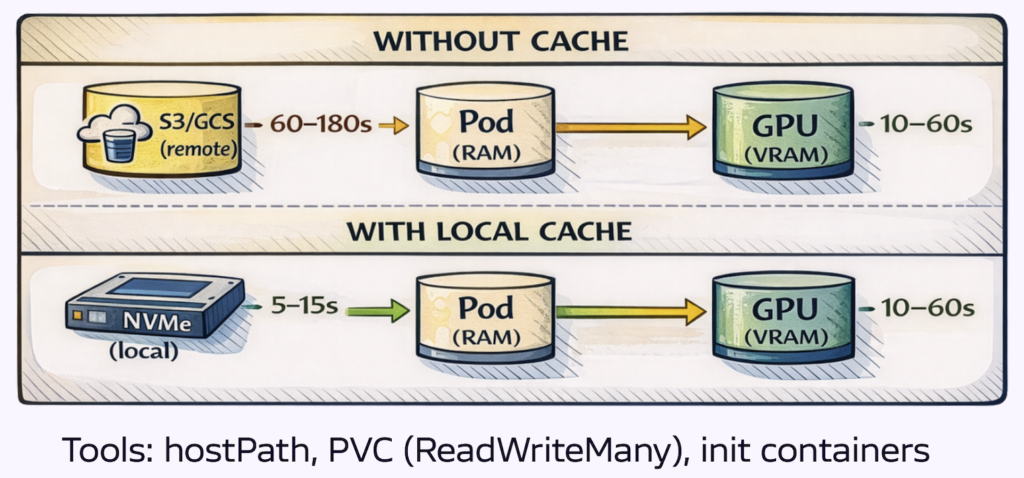 Model download from object storage often represents the largest single component of cold start time—60 to 180 seconds for large models over typical network connections. Caching models on node-local storage reduces this to local disk read time.