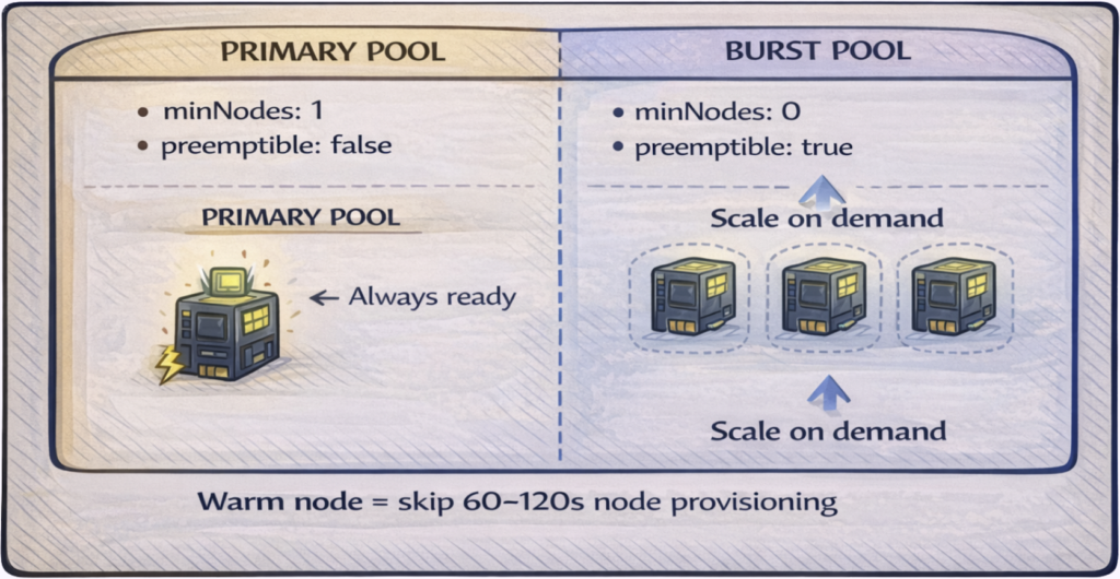 - Warm node pools eliminate provisioning time for the first pod