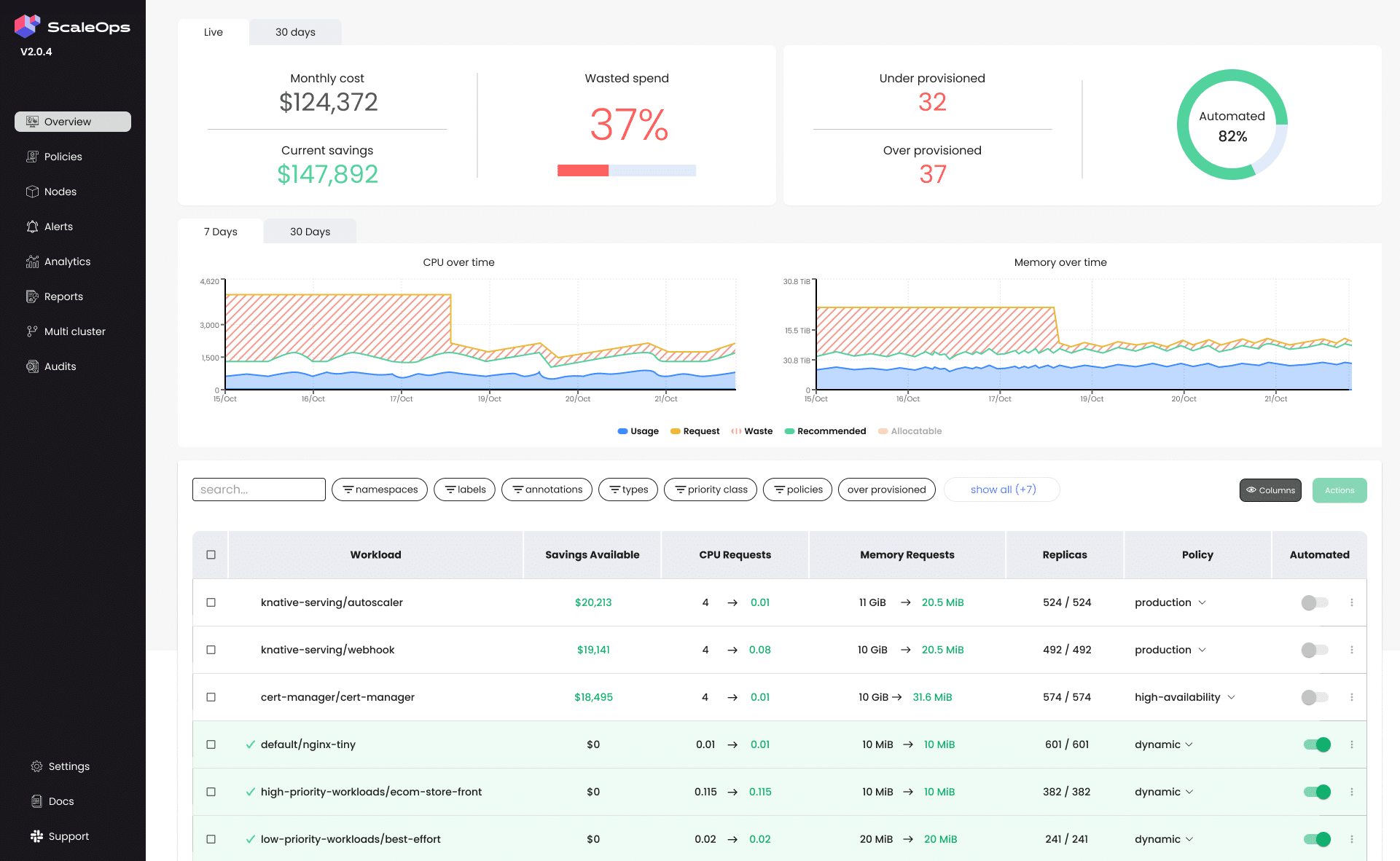 - Zero onboarding time: ScaleOps automatically identifies the workloads needed and attaches them to the best scaling policy, so teams don’t need to spend time learning and tailoring their own policy. ScaleOps does it out of the box.